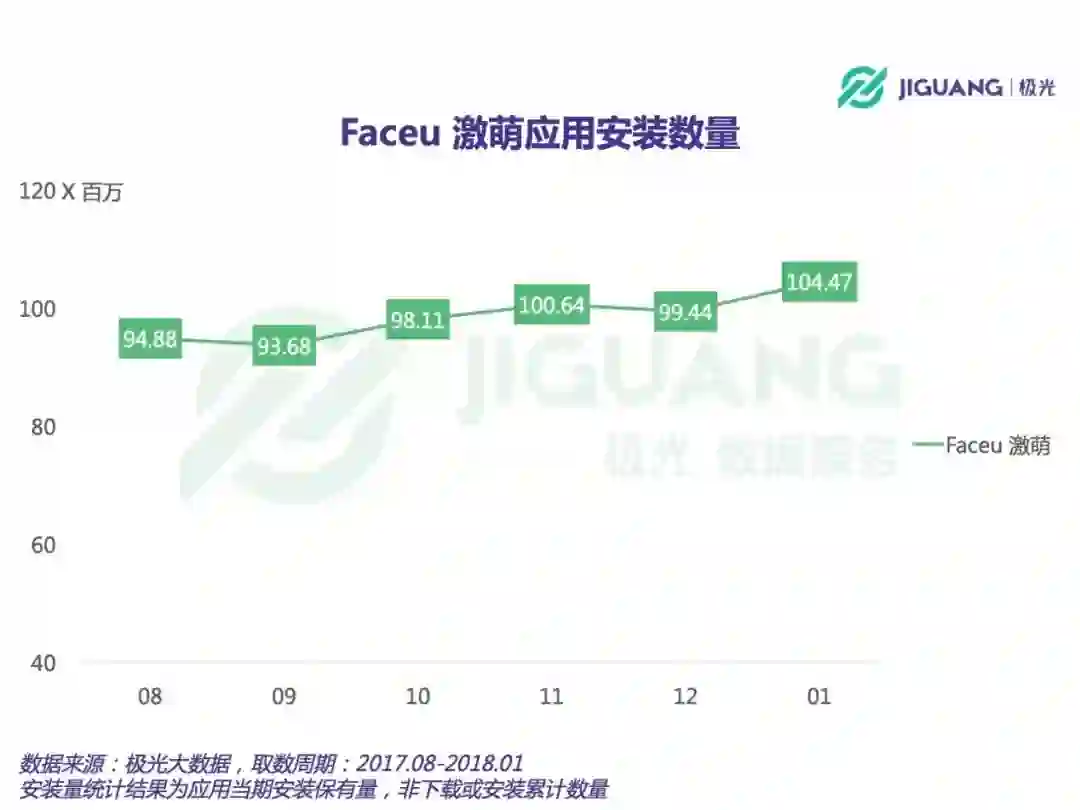 在过去半年中,Faceu激萌的应用安装量始终位于9,000万以上。截至今年1月底,这款应用的安装数量已经达到1.04亿。就用户基数而言,Faceu激萌俨然是一款“超级应用”。