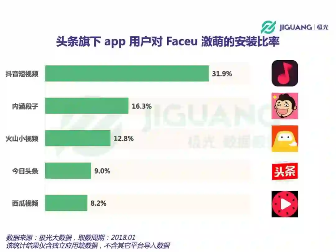 极光大数据认为,Faceu激萌的加入有助于进一步强化头条的视频生态,前者的实时图像处理技术可以提升头条旗下视频内容的使用体验,用户的高重合度也有助于双方形成良性的协同效应,提升用户忠诚度。对于Faceu激萌而言,头条的内容生态和平台资源也可以更好地促进其转型,以进一步拓展其在用户沉淀和流量变现上的可能性。