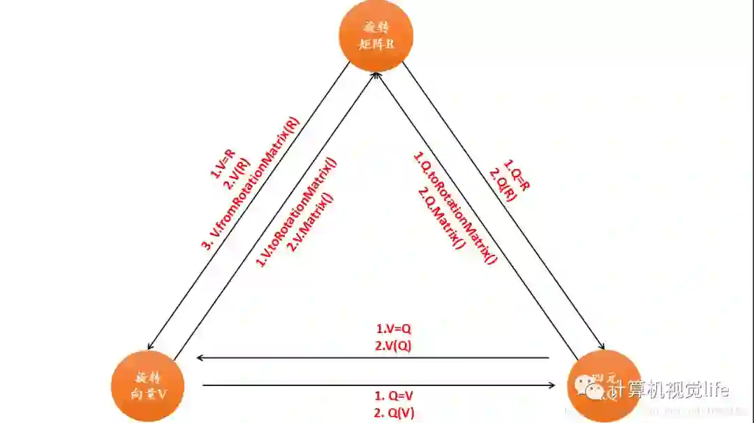 上述四种旋转表达方式是可以相互转化的。在Eigen中它们之间的转化非常的方便。下图是我看的别人总结的旋转矩阵、四元素、旋转向量之间的相互转化图: