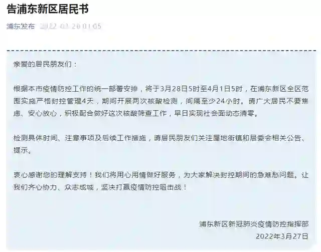 浦东新区新冠肺炎疫情防控指挥部于3月27日wi发布通知称,“根据本市疫情防控工作的统一部署安排,将于3月28日5时至4月1日5时,在浦东新区全区范围实施严格封控管理4天,期间开展两次核酸检测,间隔至少24小时。”