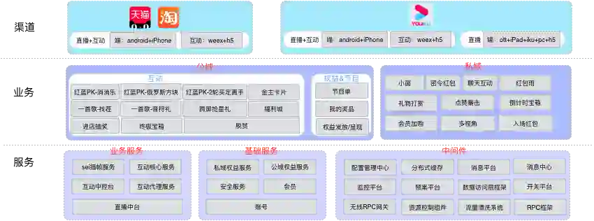 基于以上几个需求,猫晚今年的解法是第一次完全一套代码,运行到手淘、天猫和优酷,在优酷侧部署的代理服务只承载转发和适配不做其他任何业务、核心服务部署到集团机房承载所有的互动玩法和权益发放,技术架构图如下: