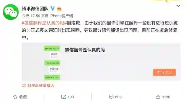 针对微信翻译被网友曝光出现误翻问题,腾讯微信团队今日下午在其官微发布回应,称由于翻译引擎在翻译一些没有进行过训练的非正式英文词汇时出现误翻,导致部分语句翻译出现问题,目前正在紧急修复中。你们发现了什么彩蛋了吗?