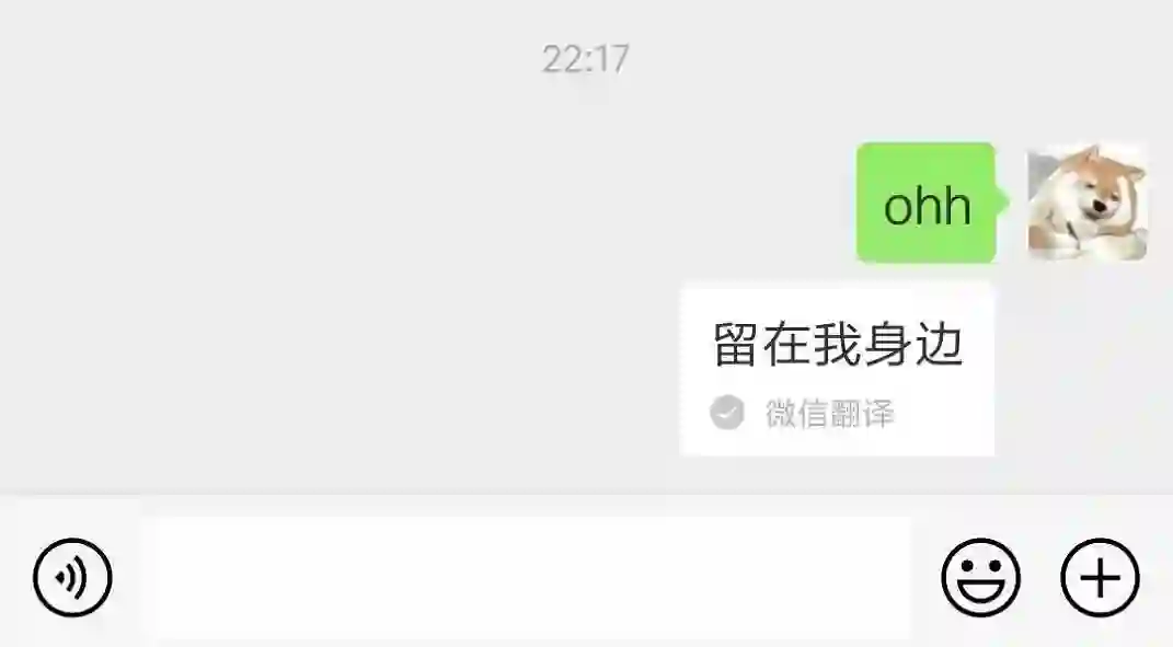 在此之前,微信翻译也曾又有一些可爱的功能被陆续发现,输入一些特殊字符后点击翻译会出现意想不到的结果。尤其是很多年刷屏的“ohh”,在当时小写英文输入“ohh”长按选择翻译就会出现“留在我身边”。