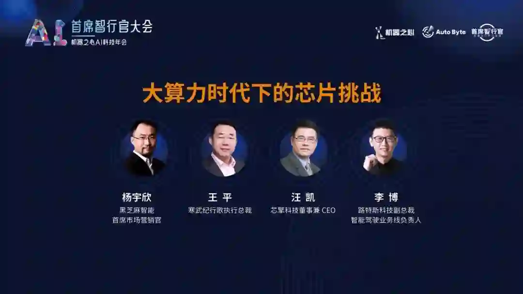 其中,大会的首场圆桌环节以「大算力时代下的芯片挑战」为主题,邀请了黑芝麻智能首席市场营销官杨宇欣、寒武纪行歌执行总裁王平、芯擎科技董事兼 CEO 汪凯、路特斯科技副总裁兼智能驾驶业务线负责人李博。