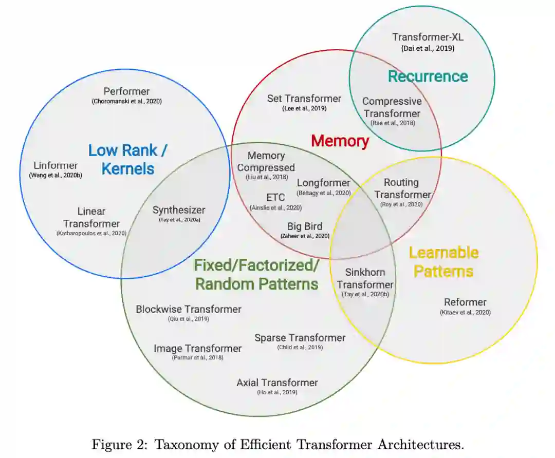 此外,这部分还详细介绍了多个重要的高效 Transformer 模型,并分析了它们的优缺点和独特之处。这些模型包括:Memory Compressed Transformer、Image Transformer、Set Transformers、Sparse Transformers、Axial Transformers、Longformer、ETC、BigBird、Routing Transformers、Reformer、Sinkhorn Transformers、Linformer、Synthesizers、Performer、Linear Transformers、Transformer-XL 和 Compressive Transformers。