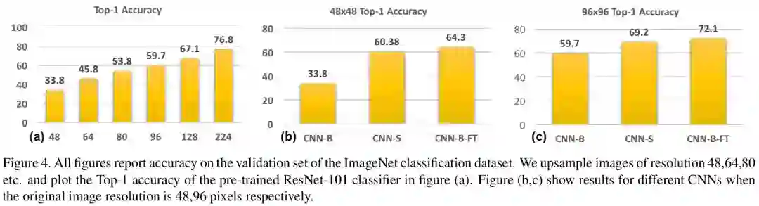 CNN-B使用224x244高分辨率图像训练。测试时,先将原图缩放48x48...128x128等尺寸,然后将图像上采样到224x224进行测试。作者发现,随着训练预测时图像尺度差异的增加,网络的分类效果变差。