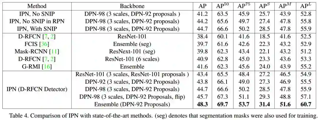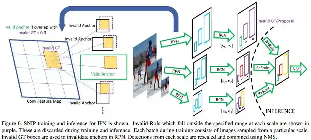 作者提出,在训练时,既希望训练数据有尽可能多的外观变化,又想将物体的尺度限制在一个合理的范围内。因此作者提出了SNIP训练方法,使用MST(多尺度图像训练)方法时,只训练目标尺度在特定范围(与预训练的图像尺寸接近)的图像,在反向传播时,忽略其他过大过小的图像。