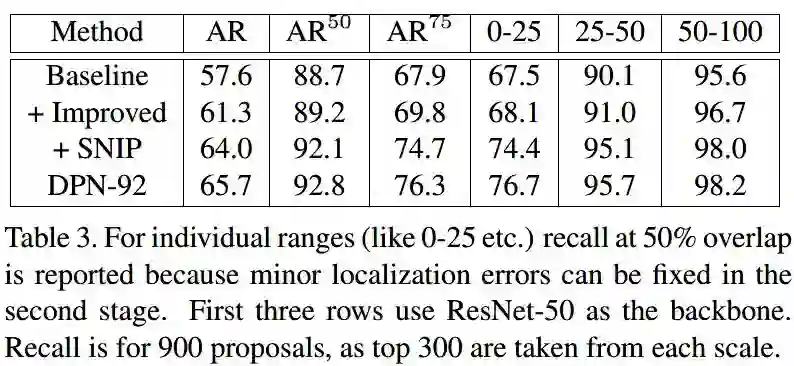 训练和测试时,忽略特定目标的规则如下: two-stage的检测器,包括RPN提取proposals,对proposals分类和bbox回归两个阶段。 在分类阶段,训练时,不选择那些proposals和GT boxes在特定大小范围外的。 RPN阶段,和无效GT boxes(大小不在范围内)的IoU大于0.3的anchor认为是无效的,忽略这些anchor。 在测试阶段,使用多个分辨率的图像进行检测;在分类阶段,去除那些回归后bboxes大小不在特定范围的检测结果。然后使用Soft-NMS将不同分辨率图像的检测结果合并。