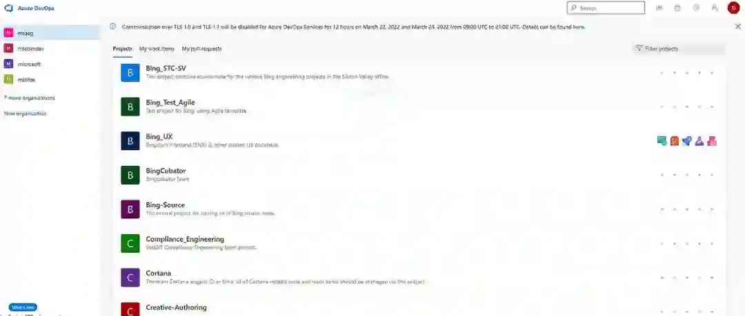 图中的Azure DevOps资源库包含了Cortana和各种Bing项目的源代码。