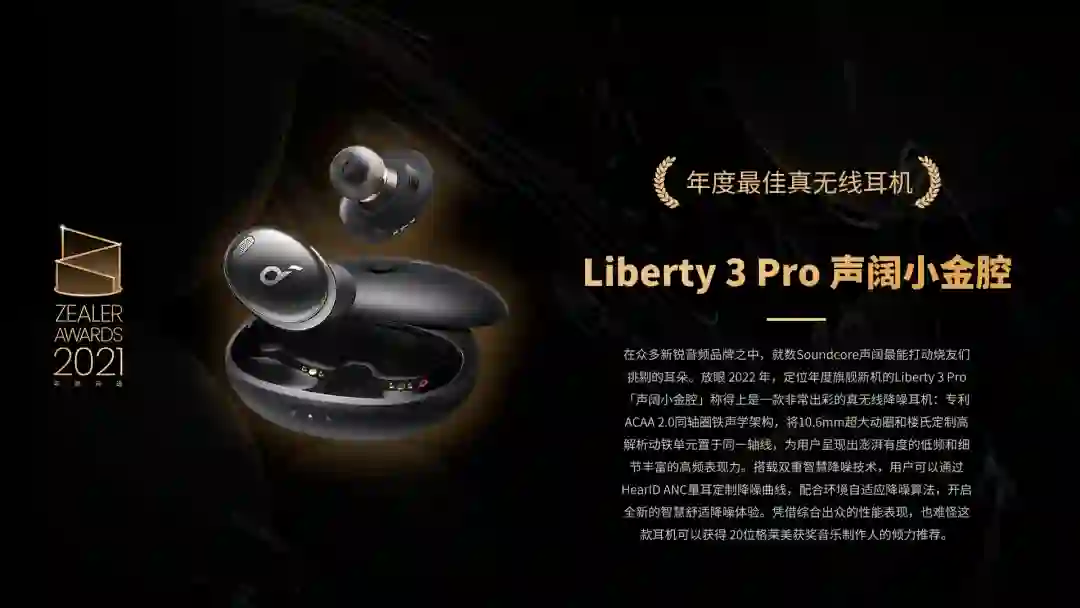 在众多新锐音频品牌之中,就数 Soundcore 声阔最能打动烧友们挑剔的耳朵。放眼 2022 年,定位年度旗舰新机的 Liberty 3 Pro「声阔小金腔」称得上是一款非常出彩的真无线降噪耳机:专利 ACAA 2.0 同轴圈铁声学架构,将 10.6mm 超大动圈和楼氏定制高解析动铁单元置于同一轴线,为用户呈现出澎湃有度的低频和细节丰富的高频表现力。搭载双重智慧降噪技术,用户可以通过 HearID ANC 量耳定制降噪曲线,配合环境自适应降噪算法,开启全新的智慧舒适降噪体验。凭借综合出众的性能表现,也难怪这款耳机可以获得 20位格莱美获奖音乐制作人的倾力推荐。