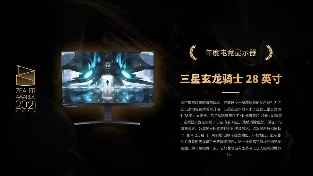要打造高质量的游戏体验,岂能缺少一块高质量的显示器?为了让玩家的电竞观感再升级,三星在去年就带来了这款三星玄龙骑士 28 英寸显示器,除了给玩家安排了 4K 分辨率和 144Hz 刷新率,这款显示器还实现了 1ms 灰阶响应,能够消除残影,保证 FPS 游戏效果。为满足次时代游戏机的连接需求,这款显示器也配备了 HDMI 2.1 接口,可实现 120Hz 画面输出。不仅如此,显示器的机身背面还提供了光环同步特性,进一步提高了沉浸式的竞技氛围。除了稍微贵了点,它好像也没有太多可以让人挑刺的地方啦。