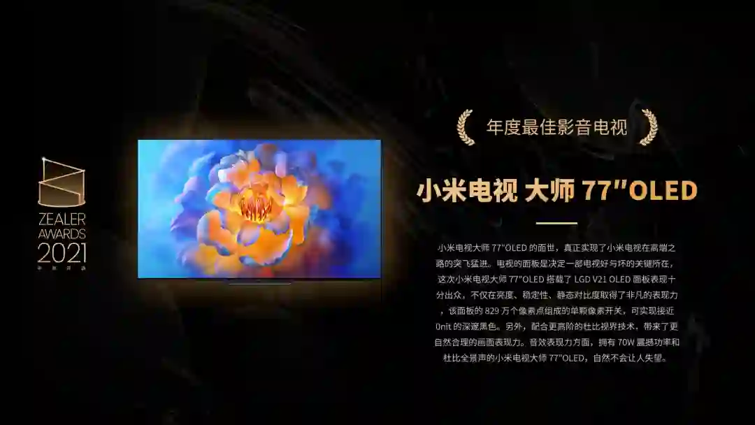 小米电视大师 77″OLED 的面世,真正实现了小米电视在高端之路的突飞猛进。电视的面板是决定一部电视好与坏的关键所在,这次小米电视大师 77″OLED 搭载了 LGD V21 OLED 面板表现十分出众,不仅在亮度、稳定性、静态对比度取得了非凡的表现力,该面板的 829 万个像素点组成的单颗像素开关,可实现接近 0nit 的深邃黑色。另外,配合更高阶的杜比视界技术,带来了更自然合理的画面表现力。音效表现力方面,拥有 70W 震撼功率和杜比全景声的小米电视大师 77″OLED,自然不会让人失望。