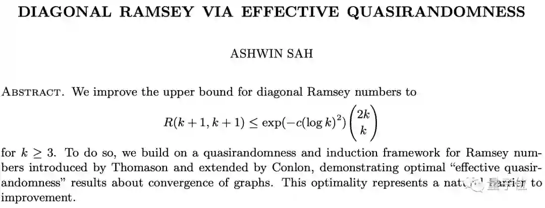 Ashwin Sah在今年5月提出的证明方法,基于2009年Conlon的论文进行了改进,并提出了两种颜色的拉姆齐数的新上限。