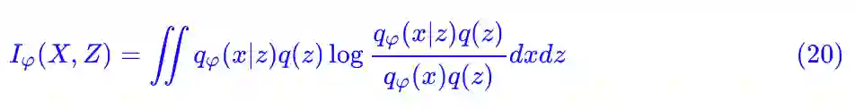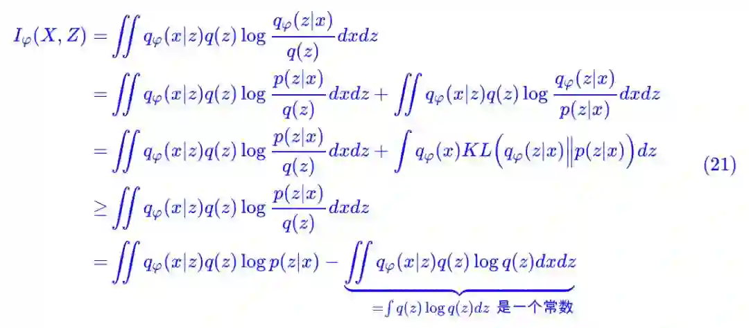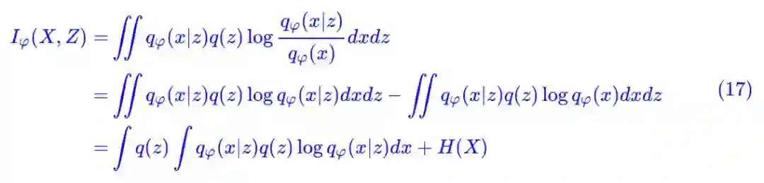 如果我们处理的是离散型分布,那么因为 x=Gφ(z) 是确定性的,所以 qφ(x|z)≡1,那么 Hφ(X|Z) 为 0,即 Iφ(X,Z)=Hφ(X)。