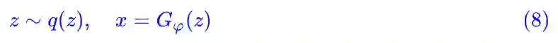 这里的 q(z) 代表着标准正态分布。也就是说,我们可以从标准正态分布中采样出一个 z 出来,然后通过固定的模型 Gφ 变换为我们想要的 x。这意味着这种分布的理论表达式是: