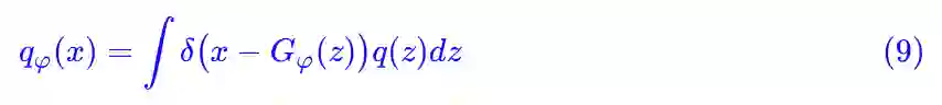 首先,我们可以利用 x=Gφ(z) 这一点: x=Gφ(z) 意味着条件概率 qφ(x|z)=δ(x−G(z)),即一个确定性的模型,也可以理解为均值为 G(z) 、方差为 0 的高斯分布 N(x;Gφ(z),0)。