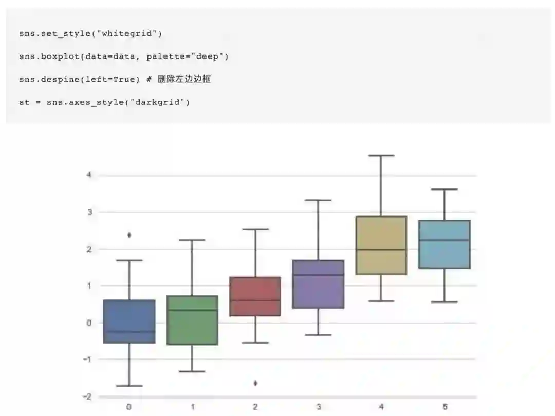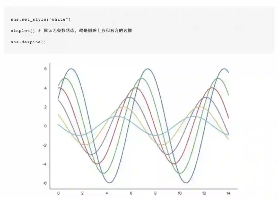 white和ticks参数的样式,都可以删除上方和右方坐标轴上不需要的边框,这在matplotlib中是无法通过参数实现的,却可以在seaborn中通过despine()函数轻松移除他们。