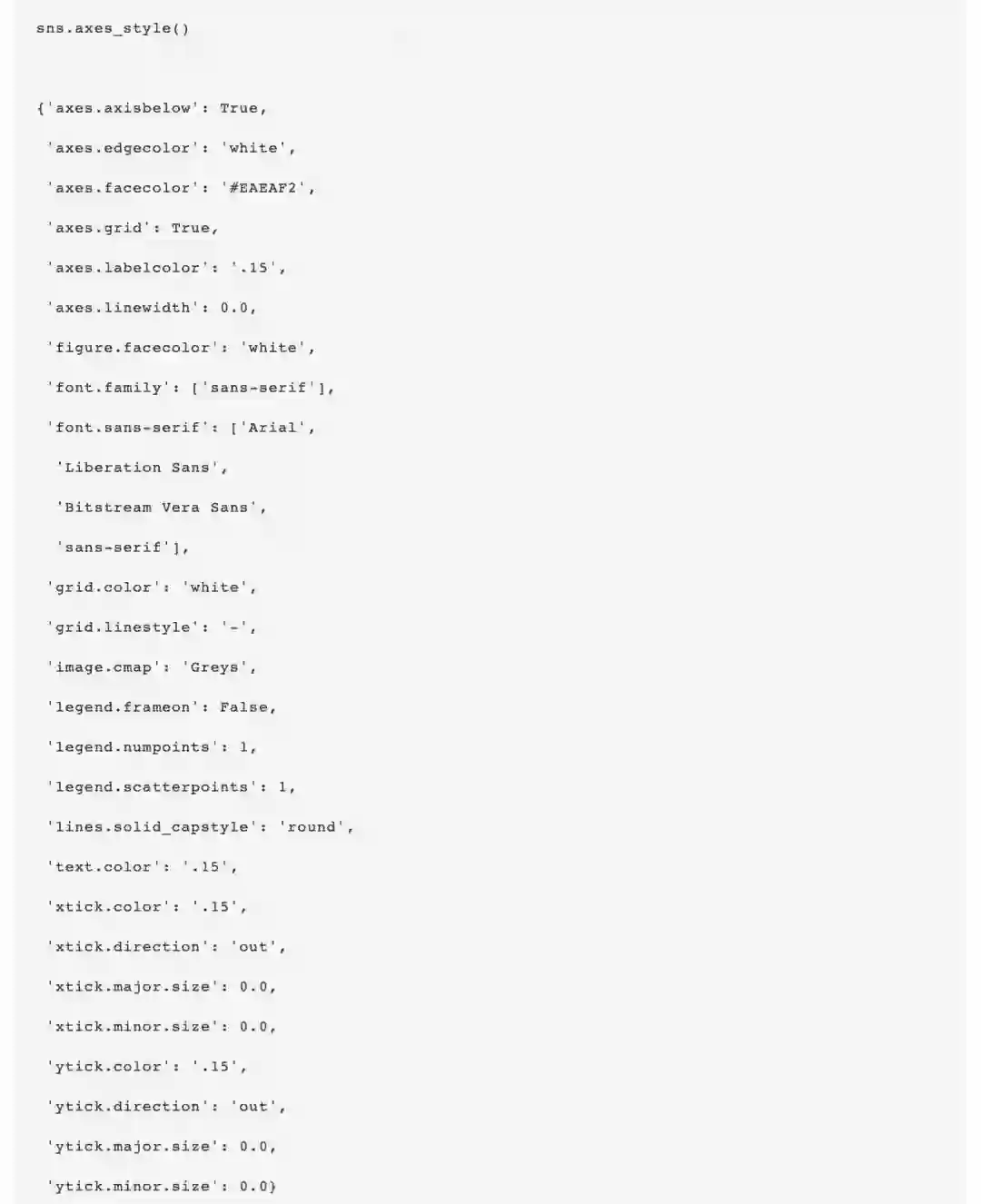 特别的可以通过sns.axes_style(style=None, rc=None) 返回一个sns.set_style()可传的参数的字典。