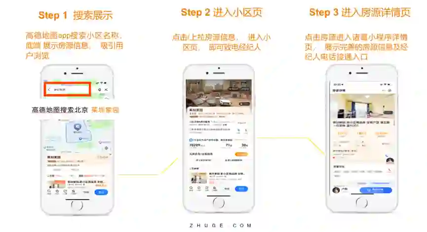 由于居住服务行业的经纪人的作业区域通常在其周边3-5公里范围内,而行业获客的最核心要素,是用户的需求区域是否匹配在经纪人的作业范围。诸葛联手高德地图和百度地图共建10亿月活级的大流量品类,研发了高精准场景的“地图找房”产品服务,经过一年多市场的充分验证,“地图找房”的产品获客量级、获客成本、投入产出比等指标远优于传统端口模式。
