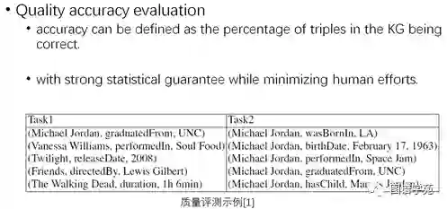 知识图谱构建完成之后,需要对构建的质量进行评测,准确率可以定义为知识图谱中正确的三元组的比例,当前的质量评测通常还是通过人工的方式进行。因此,如何保证评测可信度的前提下最大限度的降低人工的成本是十分重要的任务。对于一个人同样是查验5条三元组,如果数据的呈现方式不同,最终所花费的代价也可能不同。例如,上图中左侧的三元组由于涉及到了不同实体,而右侧的三元组涉及的是同一个实体,很明显,查验右侧的数据所耗费的时间更少。VLDB 2019的文章【1】对这个问题做了深入细致的研究。