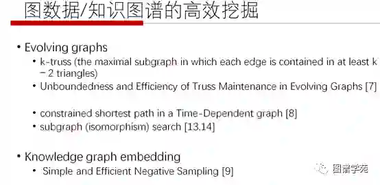 在动态图上的研究也是近两年的热点问题之一,涉及到多个经典问题的研究,包括k-truss(最大的连通子图,其中每条边被至少k-2个三角形包含)、最短路查询 【8】、子图同构搜索【13,14】等。参考文献【7】提出了在动态图上维护k-truss的高效算法,并且证明了在删除边的情况是有界的bounded(SIGMOD 2019)。除此之外,知识图谱嵌入的研究也得到了广泛的关注【9】。