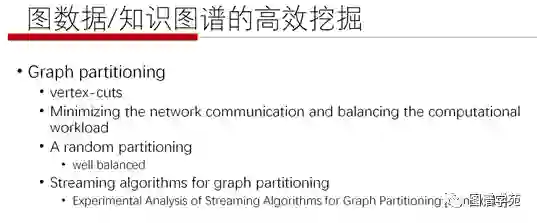 当图的规模非常大时,可能需要基于分布式的系统进行处理,而这里面有一个非常重要的问题是如何进行图的划分,划分的目的是减小网络通信的代价,并且使得各个划分的子图尽可能较为均匀,从而有助于提升并行化的程度。由于当前的数据具有高度变化的特点,也就是数据难以获得其全貌,而只能以流数据的形式进行处理,SIGMOD 2019有研究人员对这个问题进行了一个比较系统而全面的比较和分析【20】。