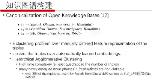 在面向文本数据构建知识图谱的过程中,一项十分重要的任务是进行三元组的规范化,即把不同三元组中实际指向同一个实体的主体(subject)或客体(object)链接到一起;类似的,对于不同三元组中的谓词或属性若是同样的意思,则也需要进行标准化。一个常用的方法是把这些三元组聚类,聚类的过程可以采用人工定义的特征,也可以基于所学到的分布式表示。然而传统的聚类大多采用的是层次聚类,时间复杂度较高,并且很多新出现的实体难以链接到已有的知识图谱中,为了解决这一问题,ICDE 2019有研究人员提出了一个解决方案【12】,作者们提出了一种同时考虑实体和关系标准化的联合策略,并且引入了领域知识。