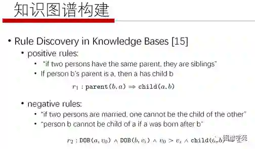 由于知识图谱在构建过程中可能有引入很多的噪音数据,如果能够在知识图谱中发掘一些规则,并基于这些规则进行知识图谱的修正,对于知识图谱质量的提升具有重大的作用。规则有正负面之分,例如,正面规则(positive rules):如果两个人具有同样的父母,这这两个人是兄弟姐妹的关系;负面规则(negative rules):如果a比b晚出生,则b不可能是a的孩子。文献【15】提出了规则自动发现的算法。