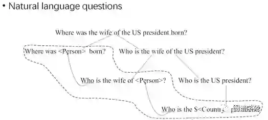例如,问句“where was the wife of the USpresident born?”可以拆解成3个简单模板,并且这三个模板之间具有依赖关系。然而对于一个复杂问句,设计一个有效的拆解算法具有一定的挑战。文献【17】给出了一个高效的拆解方案。