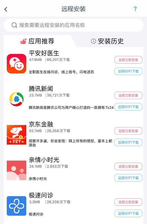 替老人远程应用下载。子女可以通过APP直接帮助老人下载应用软件并安装。