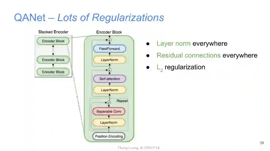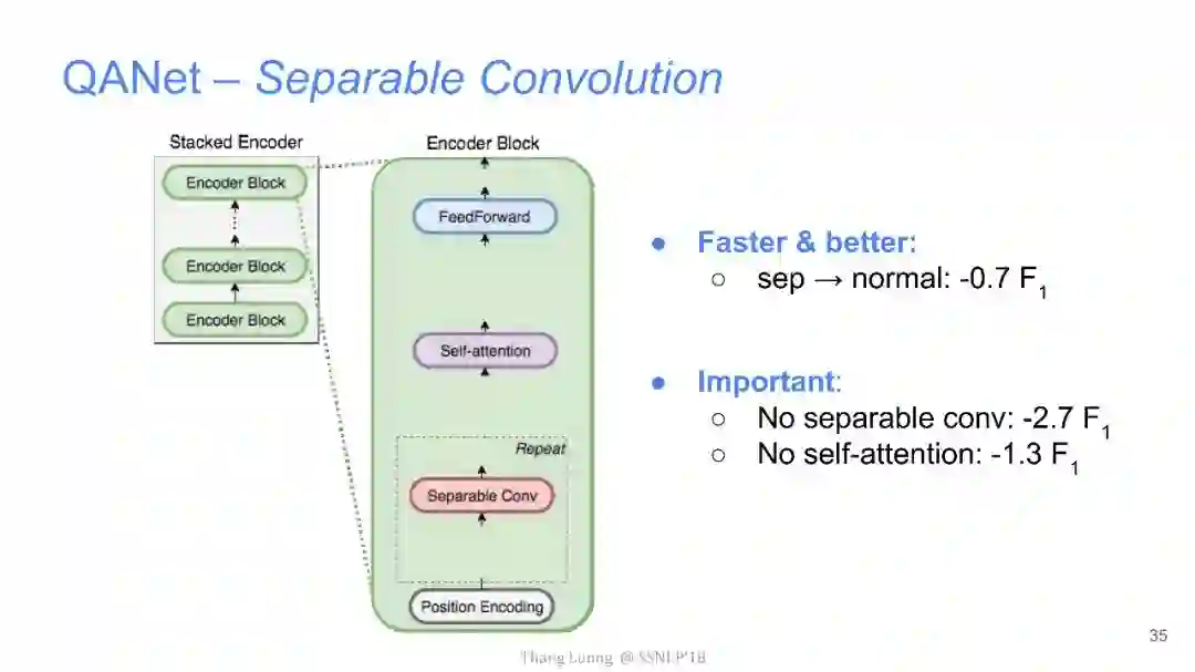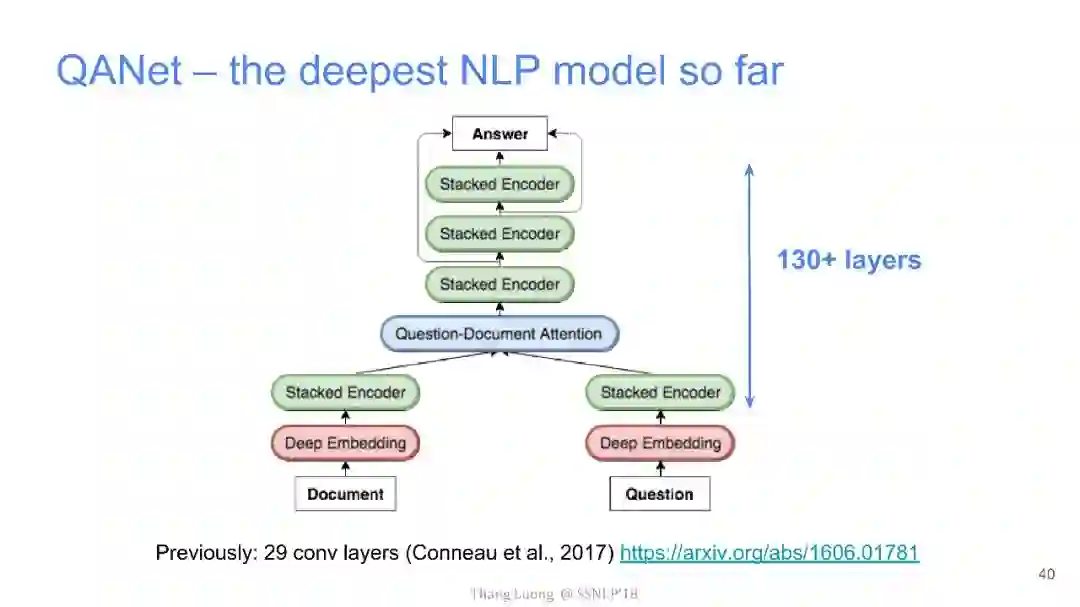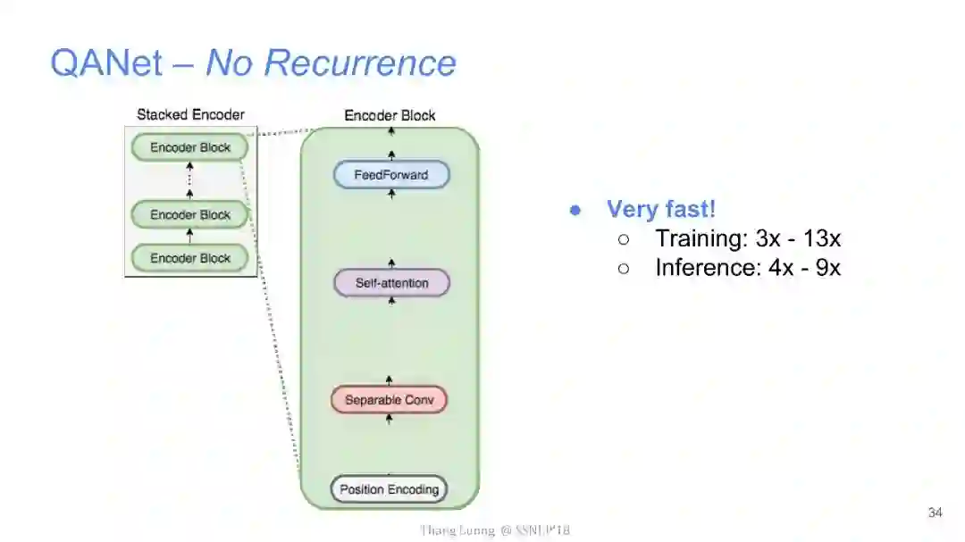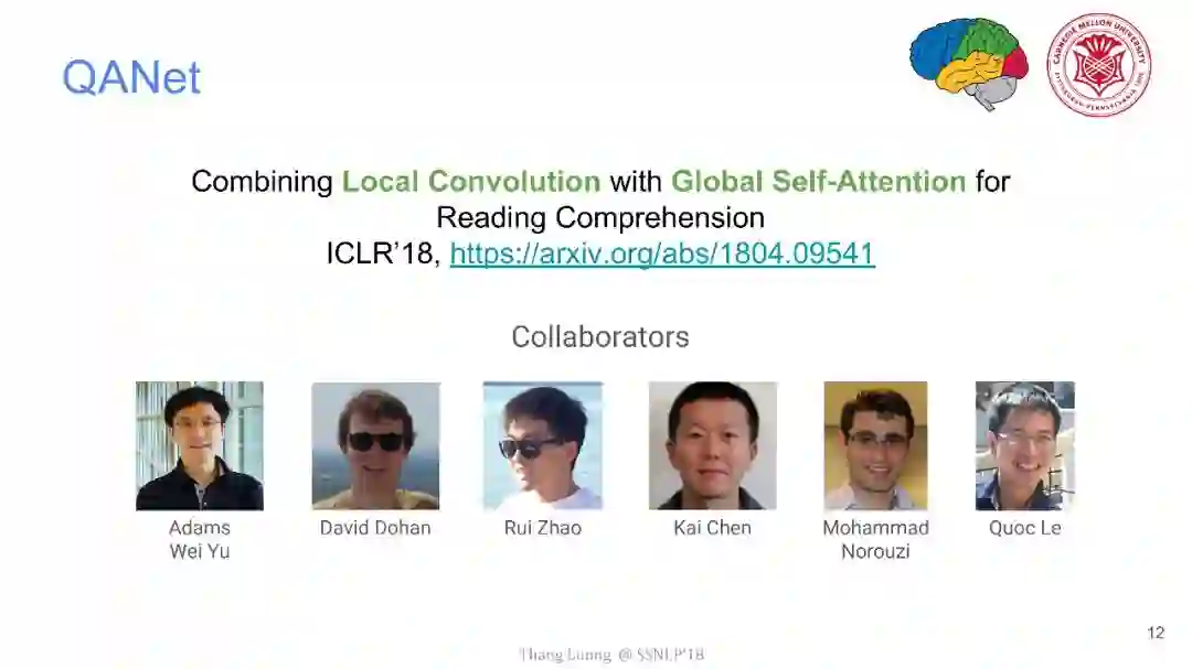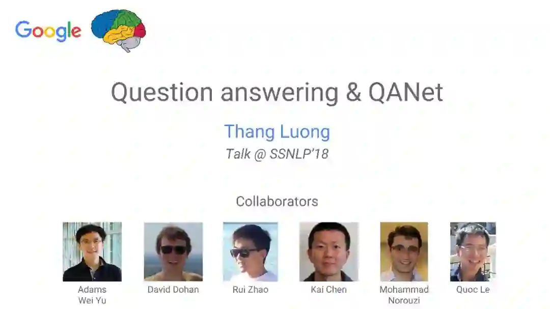 【导读】四月份来自卡内基梅隆大学和谷歌大脑的研究者发布了QANet论文,并发表在ICLR2018上,旨在提出一种新型问答模型。该模型中去除了其他问答模型中的RNN部分,仅使用卷积和自注意力机制,便达到了超越目前最优模型的效果,并使用此模型获得了阅读理解SQuAD大赛的冠军。本文来自谷歌大脑发布的最新介绍,详细介绍了该模型中的技术细节,现由专知团队整理出来,以飨读者。