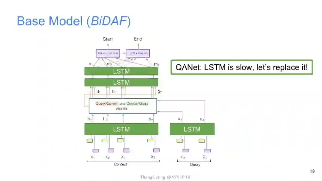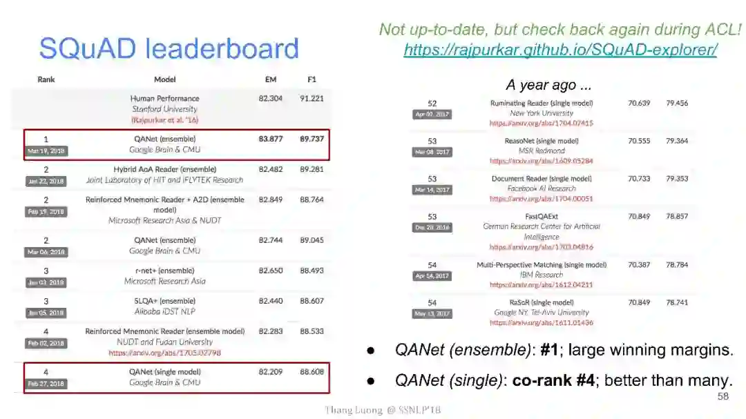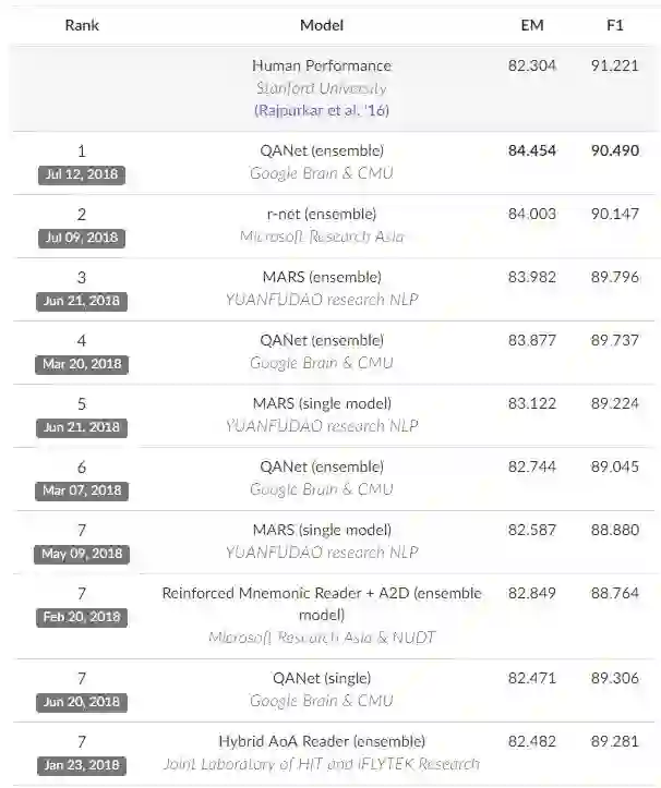 上图中是SQuAD当前的排行榜,直到近期,谷歌大脑团队和CMU联合推出QANet拔得头筹,将EM值提高到了84.454,F1值也提高到了90.490。并且,难得的是,与其他团队动辄10几个小时的训练时间相比,QANet仅仅需要45分钟的训练时间。