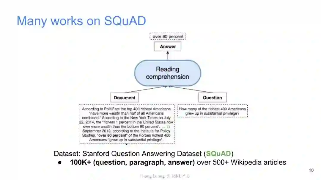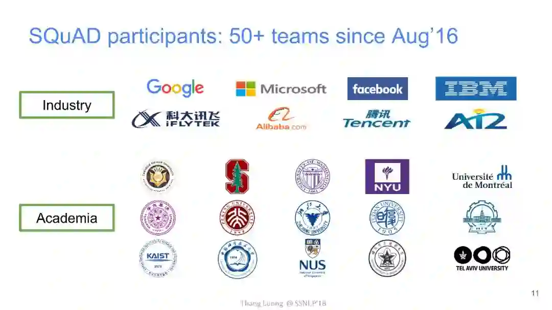 而阅读理解是问答系统的核心问题。其中,斯坦福大学在2016年推出的数据集SQuAD成为了近年来最受瞩目的阅读理解任务。可以说SQuAD对问答系统的重要性,与ImageNet在计算机视觉领域的意义相差无几。