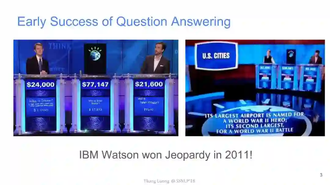 问答系统与人工智能历史上息息相关,实际上,目前人工智能领域影响甚大的图灵测试便是一个自动问答系统。为了人工智能领域的发展,业界和学术界一直致力于提出质量更好的数据集,以及举办更加有影响力的比赛来促进该领域的繁荣。