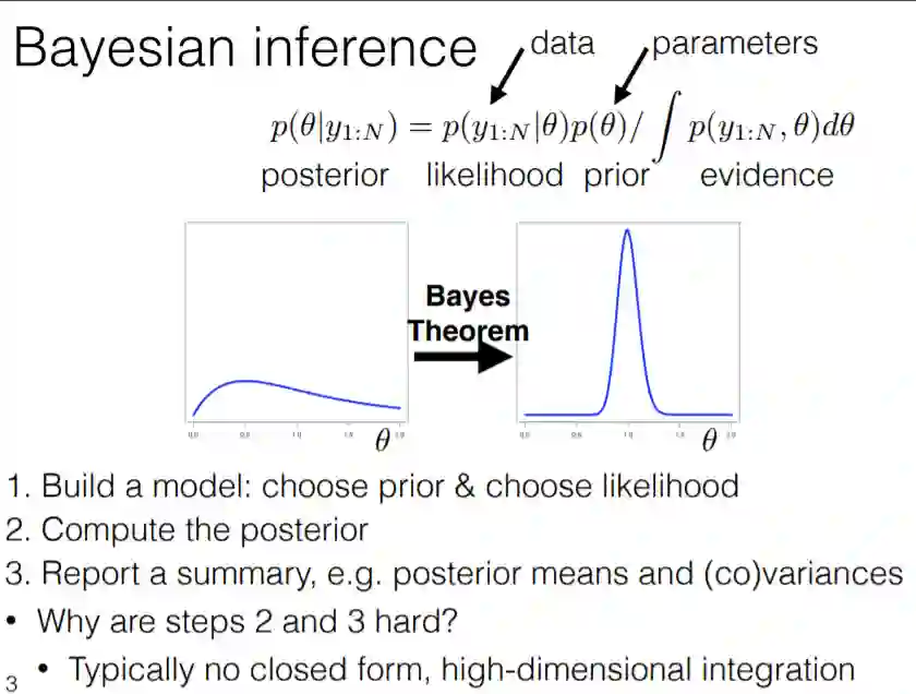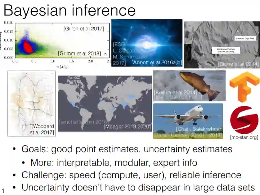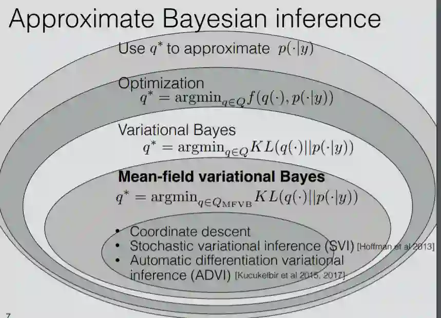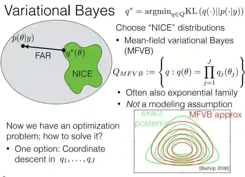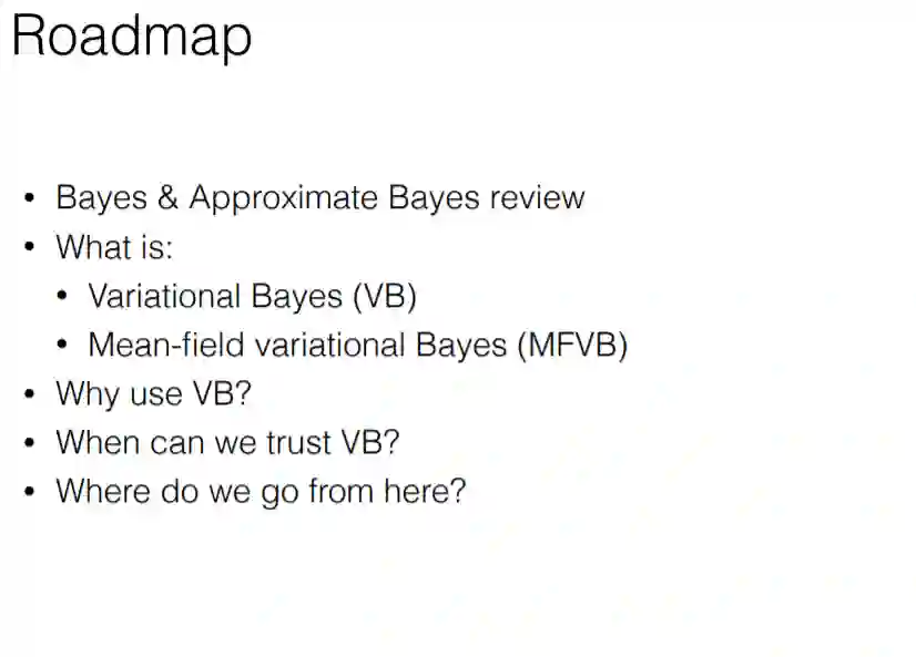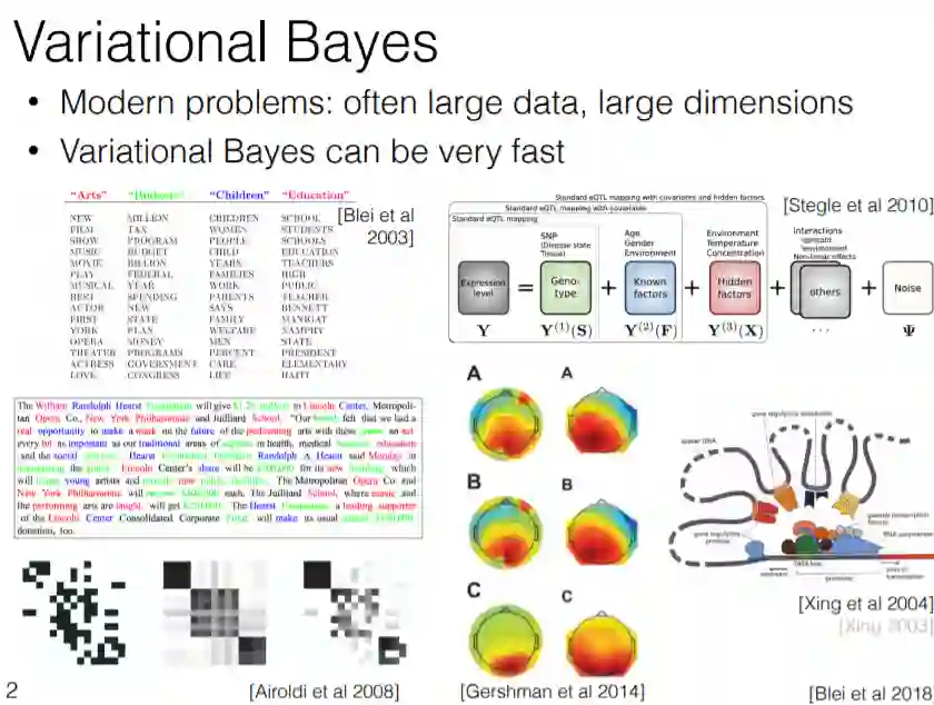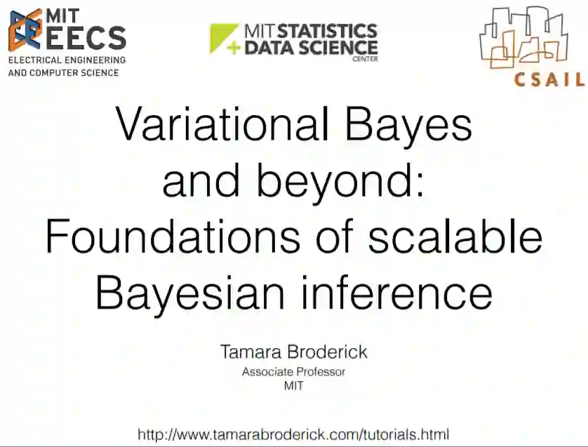 贝叶斯方法为现代数据分析提供了许多可取的特性,包括 (1)不确定性的一致性量化,(2)能够捕捉复杂现象的模块化建模框架,(3) 整合来自专家的先验信息的能力,以及(4)可解释性。然而,在实践中,贝叶斯推断需要对高维积分进行近似,而一些传统的算法为此目的可能会很慢——尤其是在当前感兴趣的数据规模上。本教程将介绍快速、近似贝叶斯推理的现代工具。“变分贝叶斯”(VB)提供了一个越来越流行的框架,它将贝叶斯推理作为一个优化问题提出。我们将研究在实践中使用VB的主要优点和缺点,重点关注广泛使用的“平均场变分贝叶斯”(MFVB)子类型。我们将注重能够让任何人使用VB,从数据分析师到理论家,都应该知道的属性。除了VB,我们还将简要介绍可扩展贝叶斯推理的最新数据汇总技术,这些技术在质量上有有限数据理论保证。我们将通过实际的数据分析实例来激发我们的探索,并指出该领域的一些开放问题。