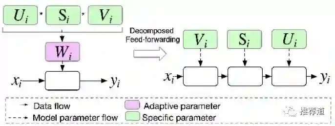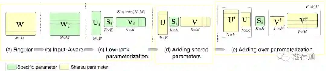 根据“场景敏感”特征动态生成的不再是一个大矩阵,而是三个小矩阵矩阵。理论上这三个小矩阵相乘的结果就等于原来的大矩阵,但是K << min(N,M)
