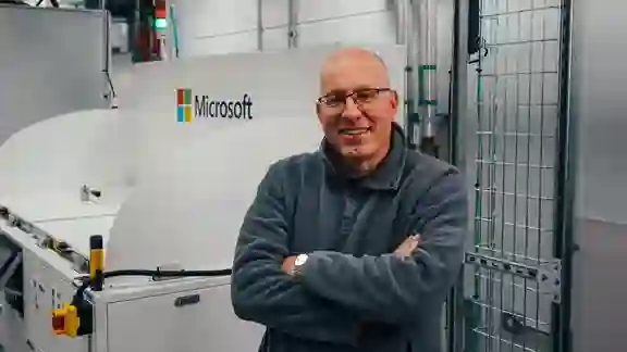 图为微软杰出工程师兼数据中心高级开发团队副总裁 Christian Belady 在位于微软数据中心的两相浸入式冷却槽旁