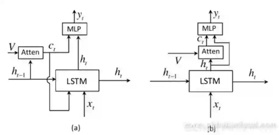 先前的注意力机制将为每个预测的单词产生二维注意图像(图像(a))。但是,对于一些停止词,我们不需要使用图像中的线索。相反,某些单词可以根据上下文生成,完全独立于图像本身。这项工作在LSTM上进行了扩展,并产生了“视觉哨兵”机制,该机制确定是否应根据上下文或图像信息(图像(b))预测当前单词。