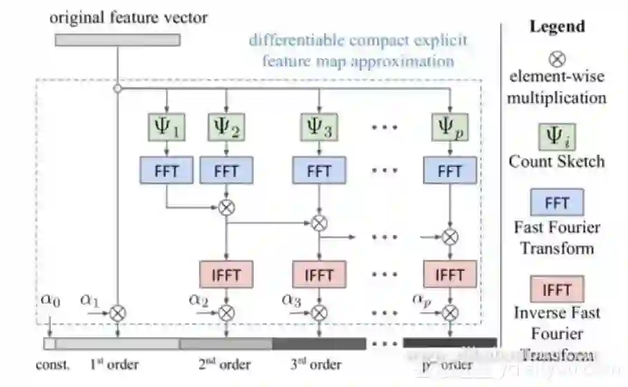 2. 近似核估计:证明在双线性收敛之后使用线性SVM分类与在描述符上使用多项式核一样有价值。因为两个描述符的向外投影等于两个独立描述符的卷积投影,所以一些研究集中于使用随机矩阵来近似描述符投影。此外,通过近似核估计,我们可以捕获超过二阶信息(见下图)。