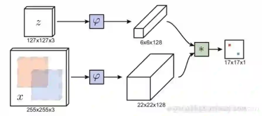 类似于面部验证的概念,利用孪生网络可以在一条线上的目标框内输入图像,并且在另一条线上输入候选图像区域,然后输出两个图像之间的相似度。我们不需要遍历不同帧中的所有其他候选区域;相反,我们可以使用卷积网络,只需要将每个图像前馈一次,通过卷积,我们可以获得二维的响应图,其中最重要的响应位置确定了框的位置。基于孪生网络的方法非常快并且能够处理任何大小的图像。