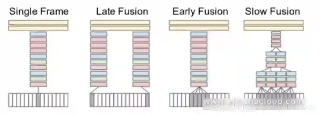 这类方法将视频视为一系列帧图像,网络接收属于视频的一组多帧图像(例如15帧),然后从这些图像中提取深度特征,并最终集成这些图像特征以获得视频的该部分的特征以对其进行分类。实验表明,使用“慢速融合(slow fusion)”效果最佳。此外,独立组织单个帧也可以得到非常有竞争力的结果,这意味着来自单个帧的图像包含大量相关信息。