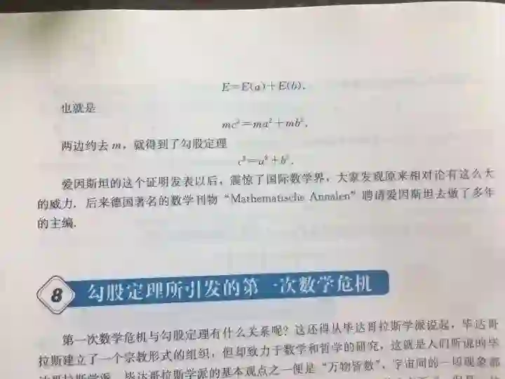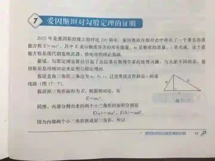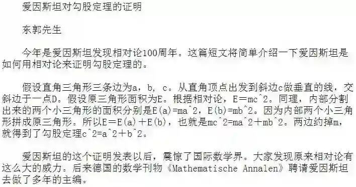课本中写到爱因斯坦用相对论中的质能方程论证勾股定理,证明发表,震惊国际数学界,德国著名数学刊物「 Mathematische Annalen」 因此聘请爱因斯坦去做了多年主编。