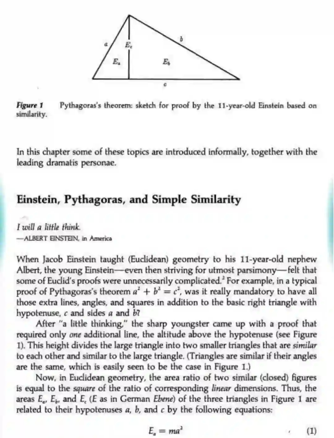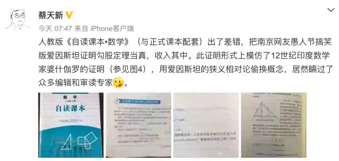 有网友翻出了英文资料的原文,书中写到爱因斯坦的叔叔在他11岁时证明勾股定理,小爱因斯坦觉得欧几里得的证明方法过于复杂。他想出了只需要在原本直角三角形的基础上增加一条线,就可以证明的方法。