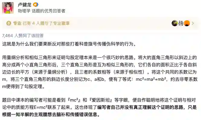 来自新加坡国立大学的学者表示,编者并没有理解勾股定理证明的思路,只是根据一知半解的主观臆想将勾股定理的证明与相对论中的质能方程E=mc²联系了起来。