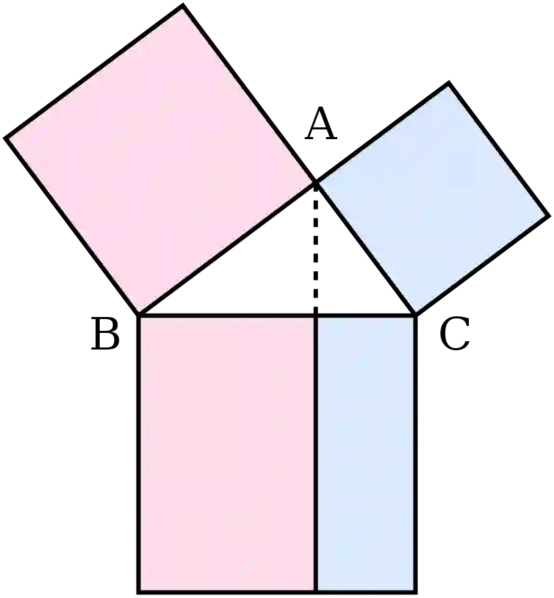 证明的基本思路为:△ABC为一直角三角形,其中A为直角。从A点画一直线至对边,使其垂直于对边。延长此线把对边上的正方形一分为二。把上方的两个正方形,通过等高同底的三角形,以其面积关系,转换成下方两个同等面积的长方形,其长方形的面积分别与其余两个正方形相等。