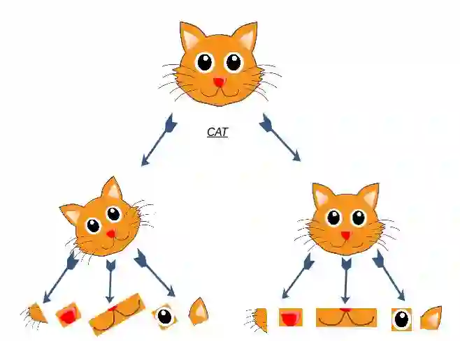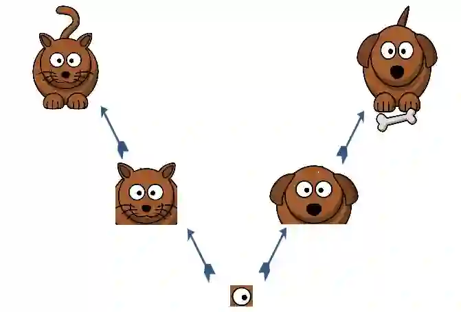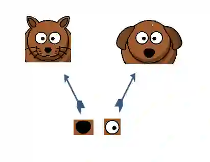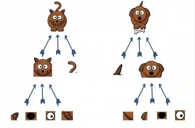 如图所示,定义非常低级的面部特征,比如眼睛、耳朵等,并将其结合以找到一个脸。之后,将面部和身体特征结合来完成相应的任务——判断它是一只猫或狗。