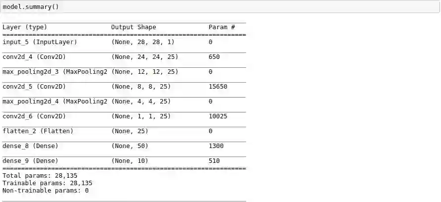MaxPooling2D(pool_size=pool_size),Convolution2D(25, 4, 4, activation='relu'),Flatten(),Dense(output_dim=hidden_num_units, activation='relu'),Dense(output_dim=output_num_units, input_dim=hidden_num_units, activation='softmax'),])model.compile(loss='categorical_crossentropy', optimizer='adam', metrics=['accuracy'])