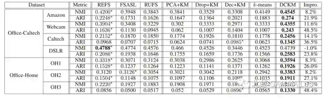 表1 在两个数据集上进行聚类结果。''*''表示基准的最佳性能。所有方法的最佳结果以粗体显示。最后一列表示与最佳基准相比,所提出的方法相比最佳对比方法所获得的改进百分比。