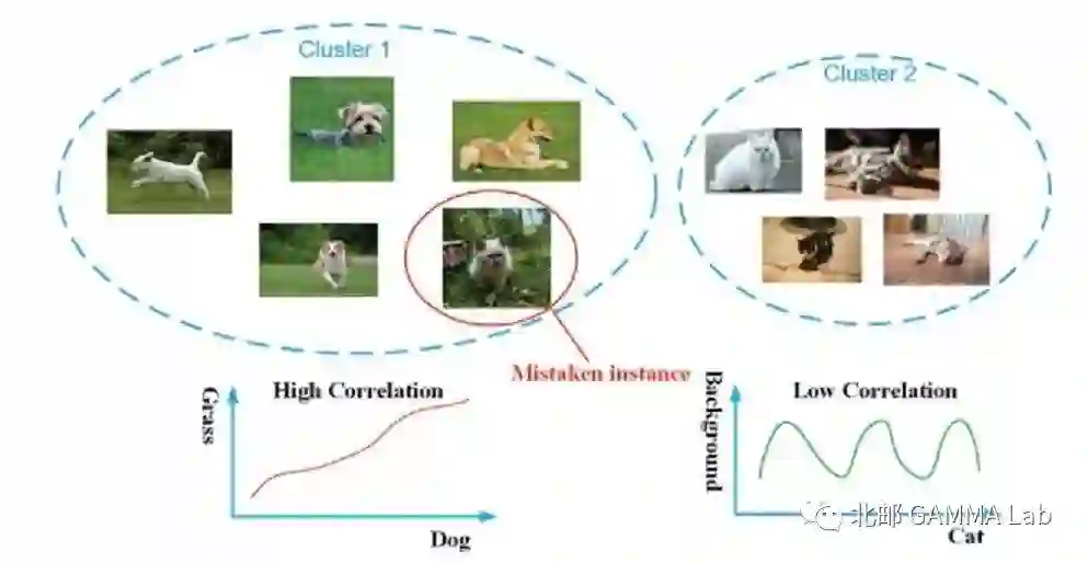 尽管在神经网络中去相关性取得了巨大的成功,但是在无人监督的学习场景中,数据选择偏差的影响被严重低估了。通常,聚类也会遭受数据选择偏差问题。数据选择偏差可能会导致特征之间的虚假关联。假设一个虚假的特征被错误地识别为与一个重要的特征相关联,由于存在虚假相关,这种无意义的特征的作用将在不知不觉中得到增强,从而使固有的数据分布无法得到揭示。因此,对这些数据进行聚类将不可避免地导致性能下降。如图1中所示,给定一个图像数据集,其中有很多狗在草地上,有一些猫在各种背景下,很容易得出结论,草的特征与狗的特征高度相关,而猫的特征与与背景的相关性较低。因此,在对这种有偏向的数据集执行聚类算法时,草地上的任何对象(甚至是猫)都将很有可能被聚类到狗类。这意味着由于特征之间存在虚假相关性,很容易误导聚类算法。