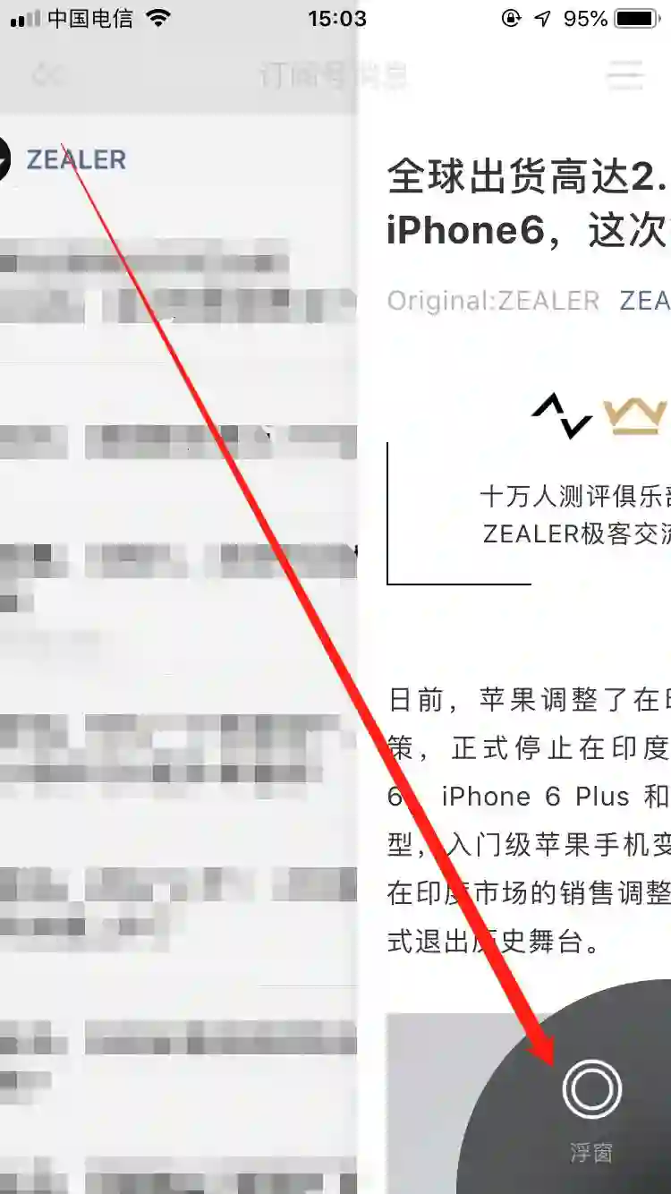 其次,是操作上的改变。之前浮窗功能是需要用户点击公众号的文章右上角的菜单栏再点击里面的浮窗按钮,之后浮窗才会显示。而如今则是直接通过滑动方式即可触发浮窗效果。